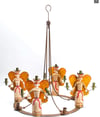 Charming Folk Art sixteen candle chandelier. Carved and painted wooden angels sat on a wrought iron frame. Each angel can be separated from the metal frame and stand as a separate candleholder. Four painted angels each with three sconces, on a circular metal frame with four furthest sconces, with four support rods raising to a ceiling hook. Height 94 cm width 68 cm each angel is 32 cm in height. Good original condition. A great fun and rare thing. Can be separated for postage. £480 including courier delivery or collect DM me if interested.